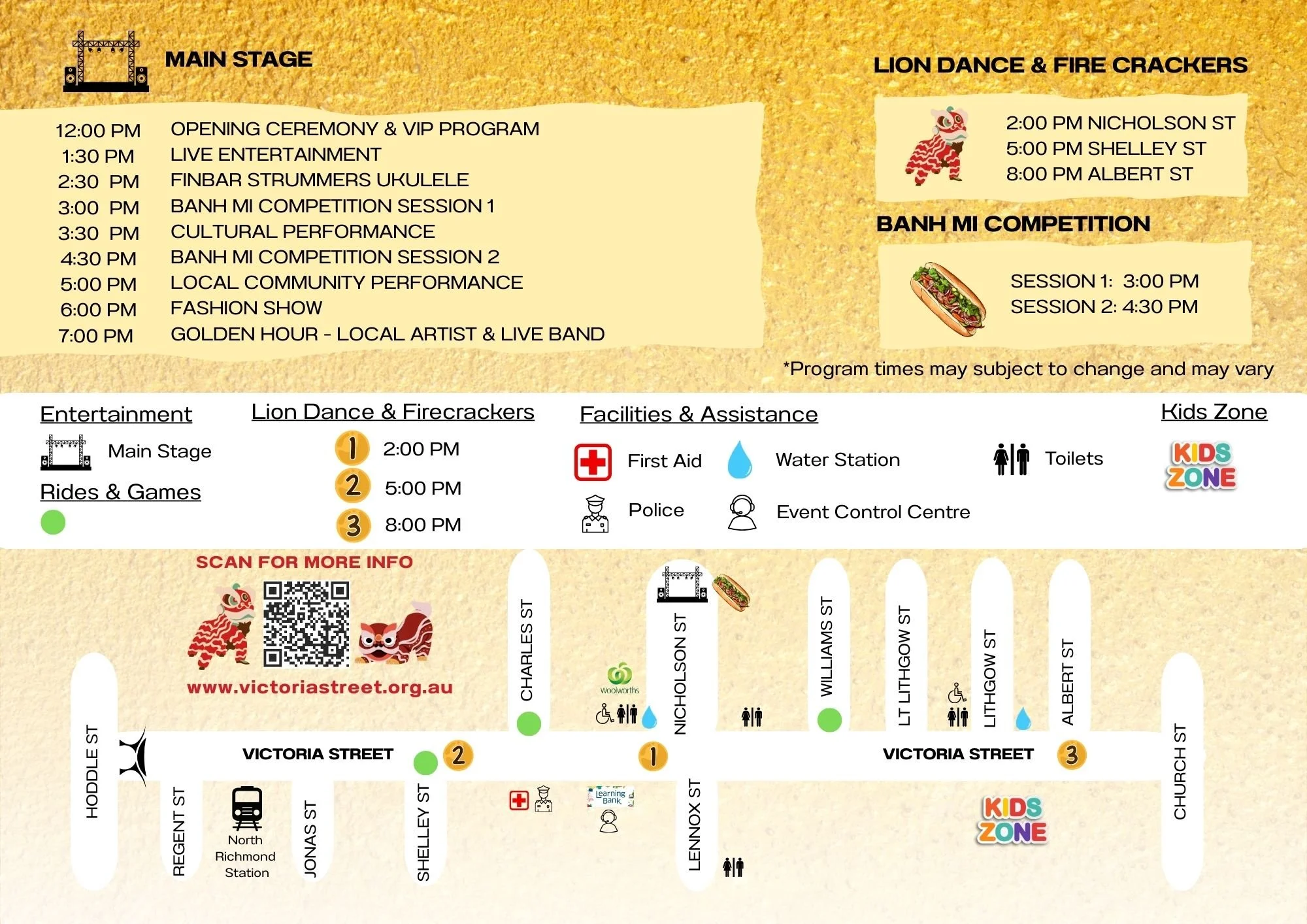 Live Performances & Lion Dance: Enjoy multicultural performances on the Main Stage (Nicholson & Victoria St), plus high-energy Lion Dance & Firecrackers along Nicholson, Shelley, and Albert Streets.